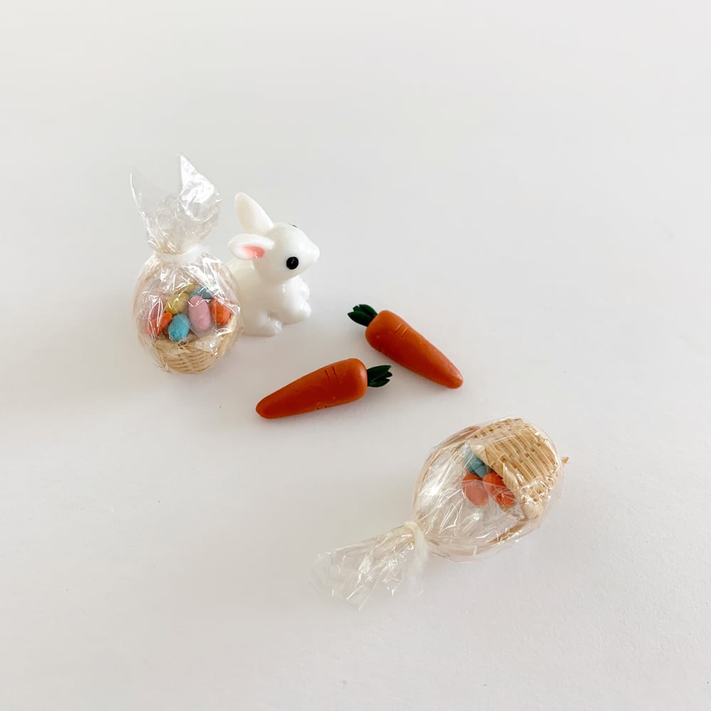 Note: Miniature Easter baskets with eggs do NOT all sit fully flat on the bottom...some need to be set against another item or glue-dotted to stand upright; bunny and 2 carrots sold as a set; Easter baskets sold separately