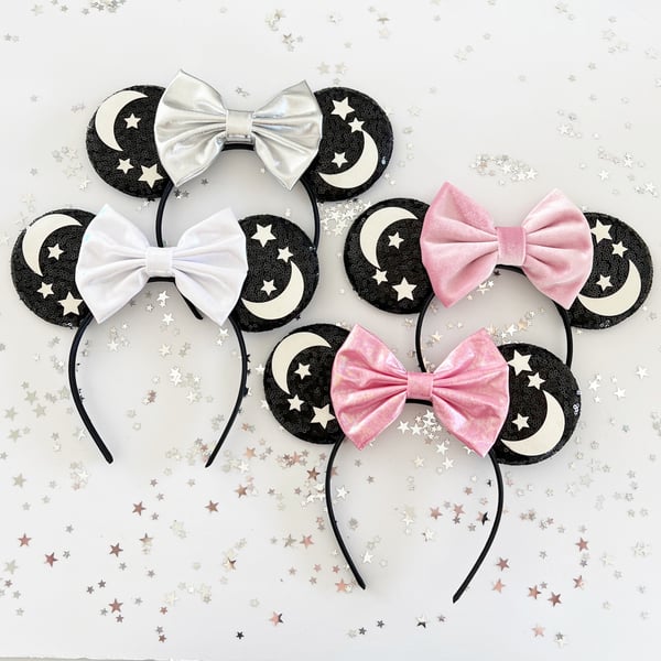 Moon and Stars Mouse Ears with Pink, Silver and White Bows