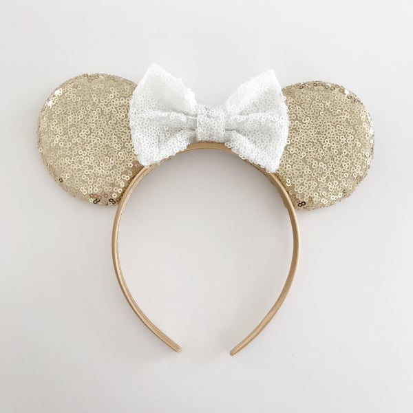 Gold sequin mouse ears with white sequin bow