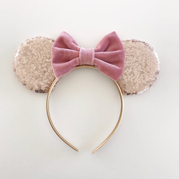 Rose gold sequin mouse ears with dusty rose velvet bow